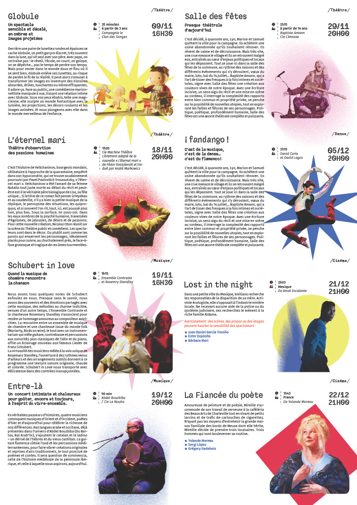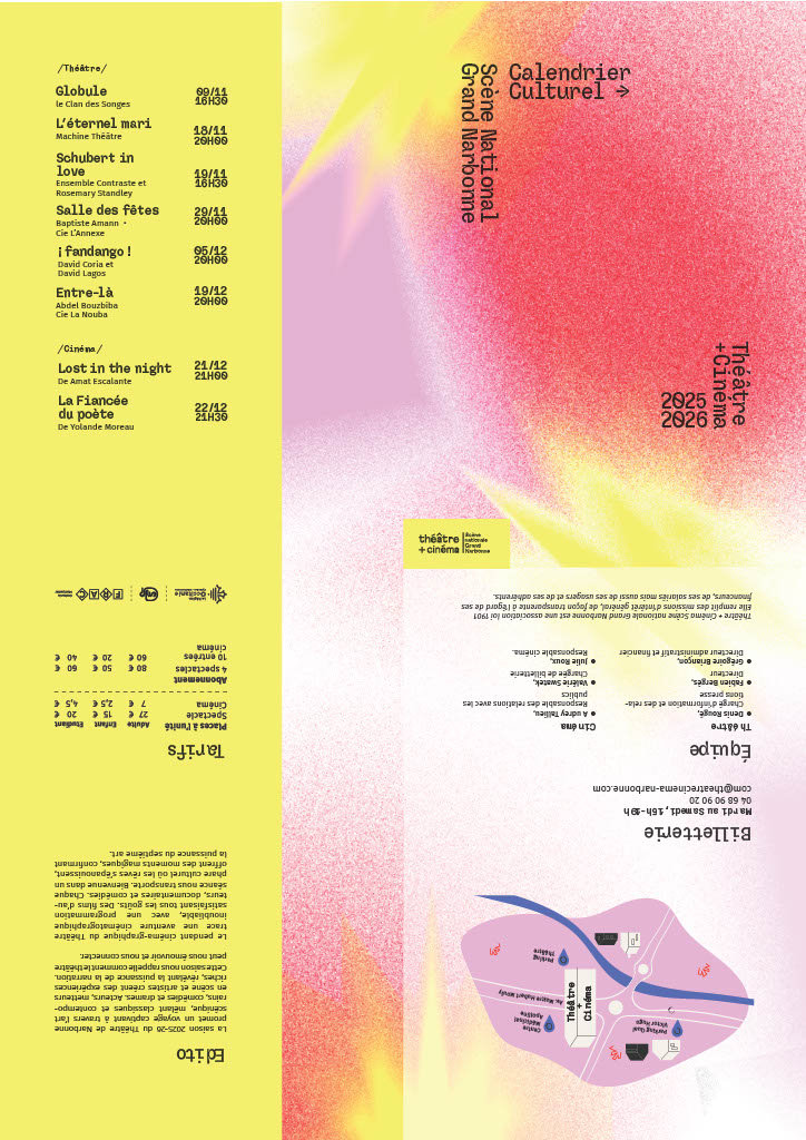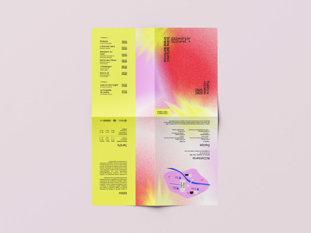 Création d’un support de communication imprimé pour un théâtre dans le cadre d’un projet fictif. La direction artistique repose sur des couleurs vibrantes, des dégradés texturés et une mise en page structurée, permettant de valoriser la diversité de la programmation. Le projet cherche un équilibre entre lisibilité, impact visuel et expression contemporaine de la scène culturelle.